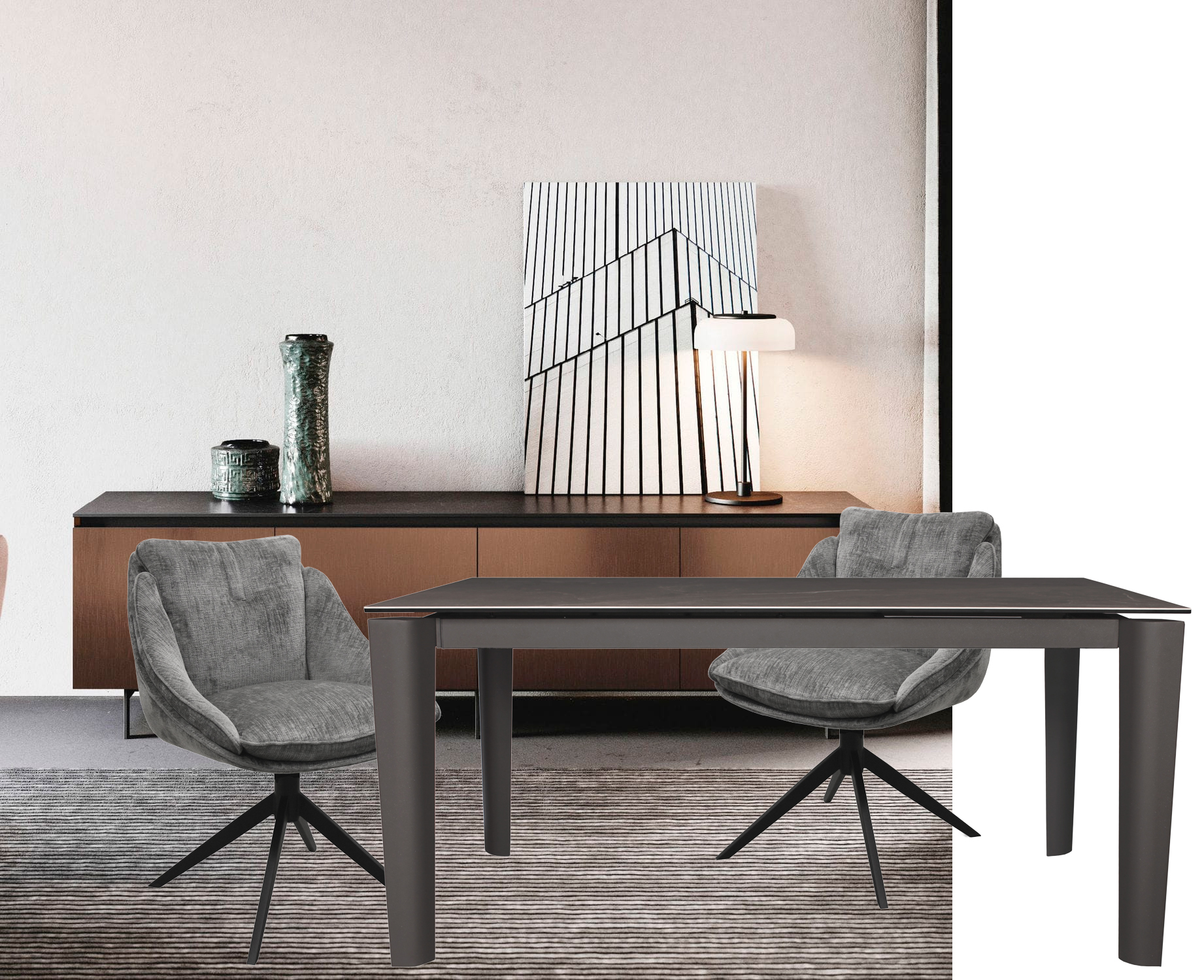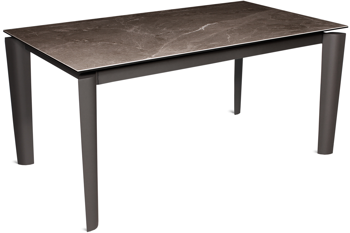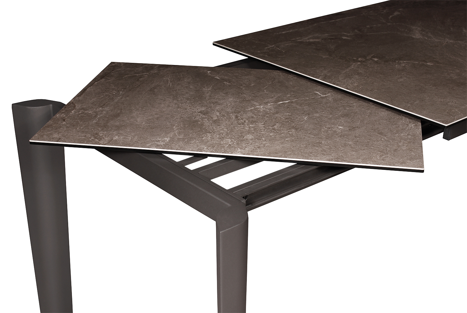 Модель RICCARDO для многочисленных приверженцев минимализма в интерьере городской квартиры. Прекрасно подойдет для совмещенных обеденно-гостиных пространств. Стол выполнен в теплой антрацитовой гамме. Металлические ножки красивой обтекаемой утонченной формы поддерживают матовую керамогранитную столешницу с ненавязчивым рисунком мраморных прожилок. Примечателен механизм торцевого раздвижения стола – ножки оснащены специальными роликами для легкого раздвижения подстолья, а большая керамическая вставка с помощью простого поворота увеличивает подстолье на 60 см, то есть на два полноценных посадочных места.